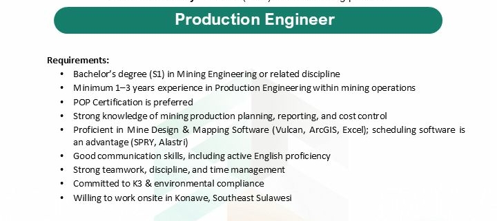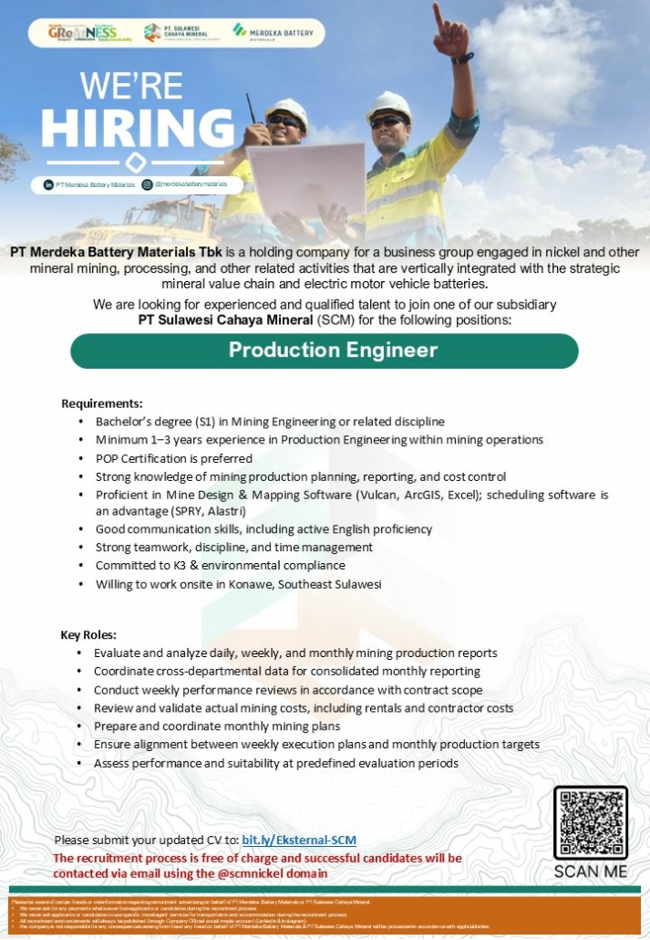 PT Sulawesi Cahaya Mineral (SCM), a subsidiary of PT Merdeka Battery Materials Tbk, is seeking qualified professionals to join our team as Production Engineer; applicants with a background in mining engineering and relevant experience are encouraged to apply by submitting their updated CV through [bit.ly/Eksternal-SCM], with the application period closing on 25 January 2026.