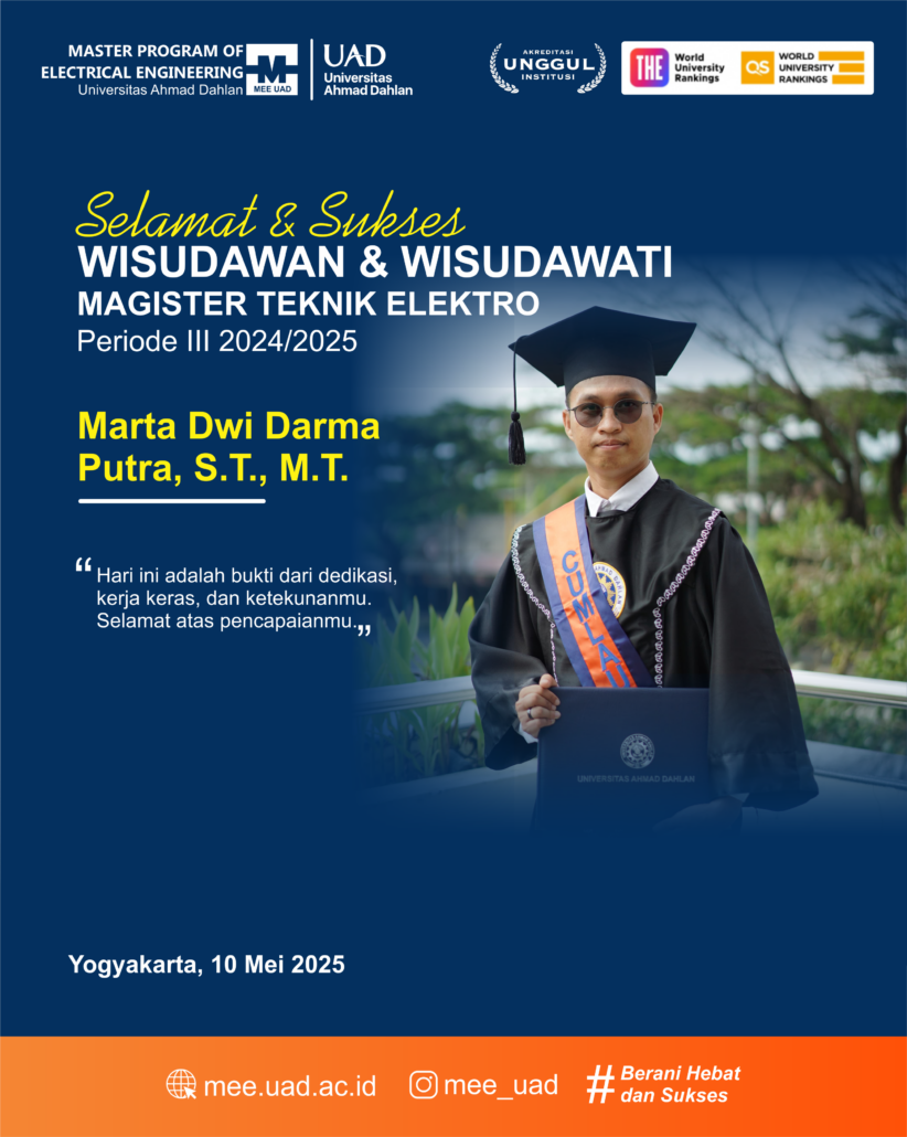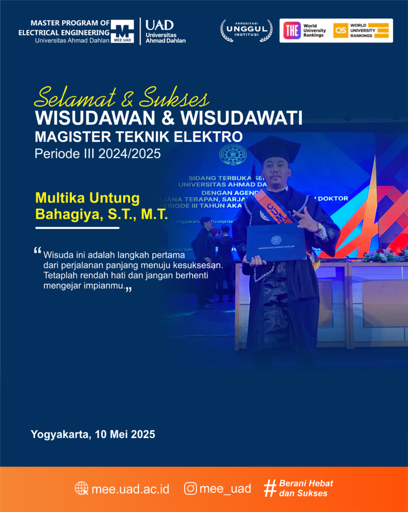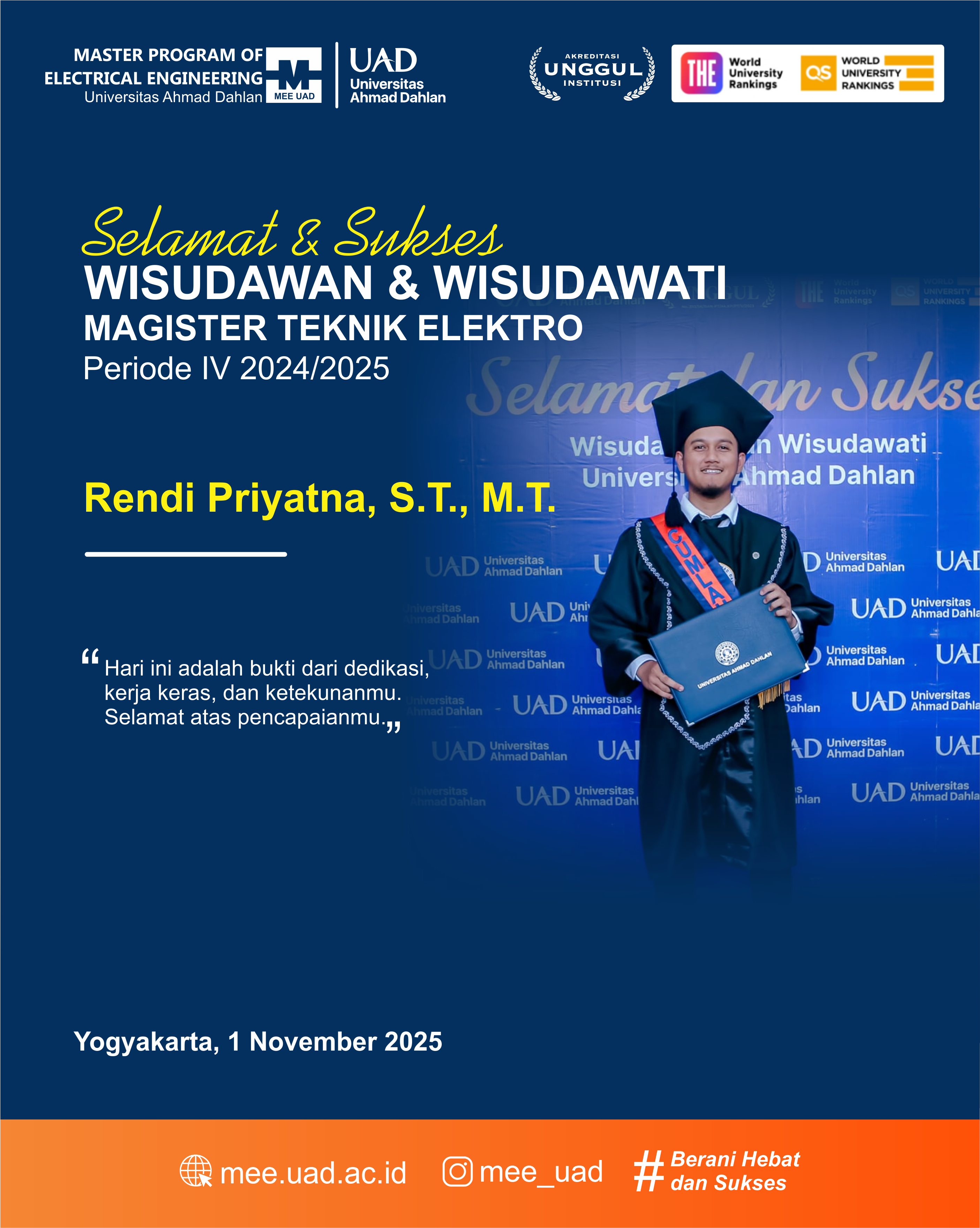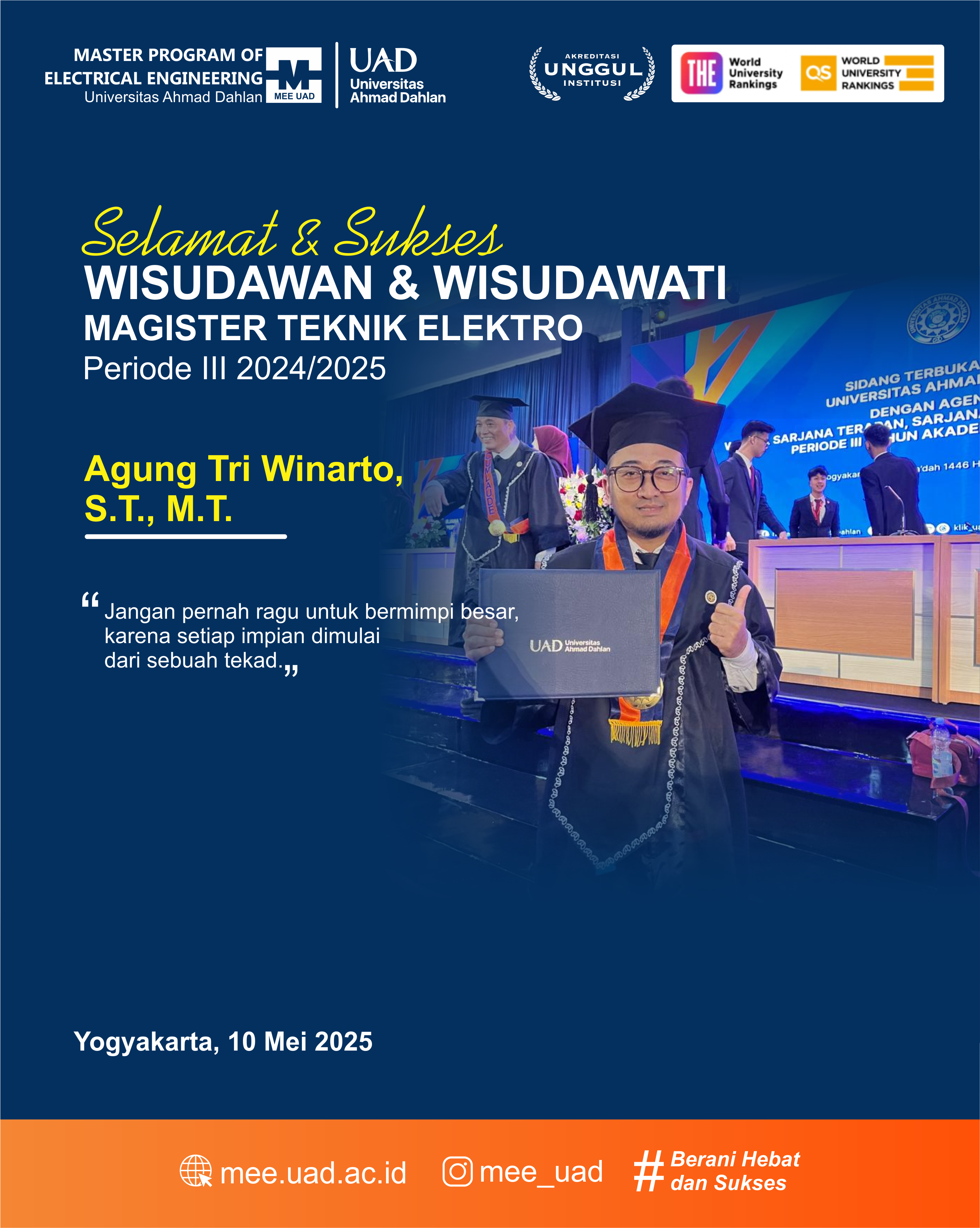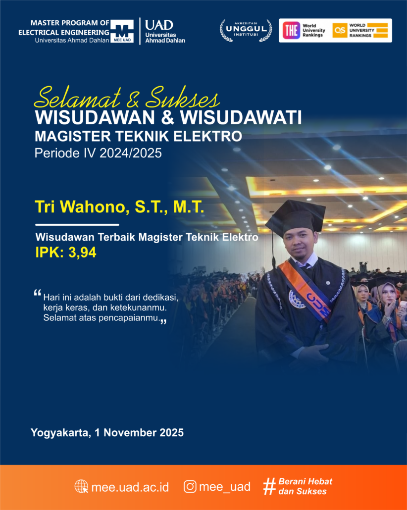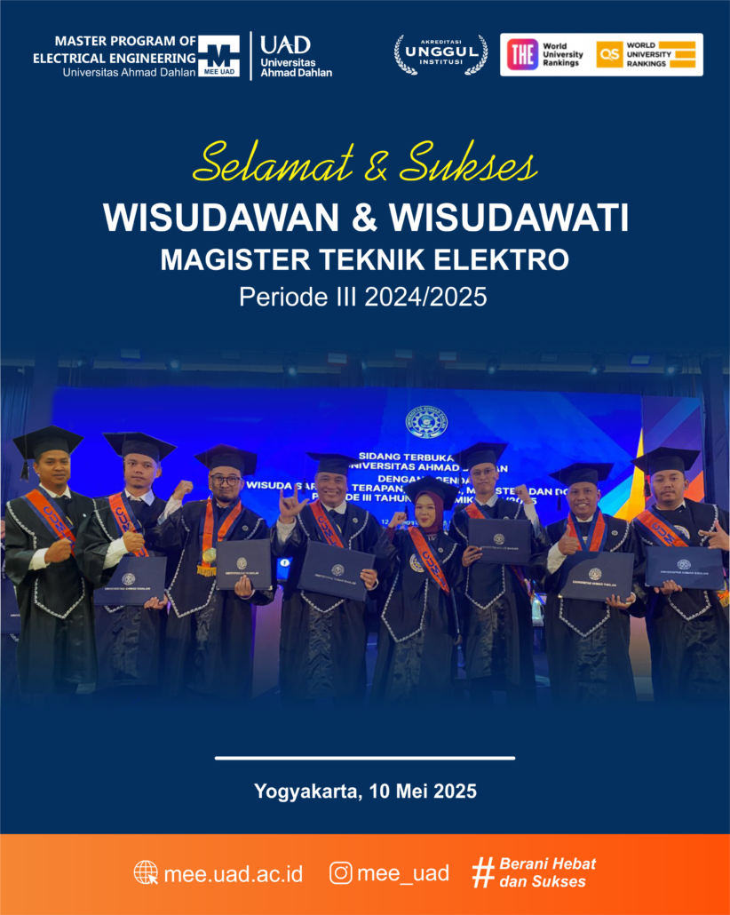 Alumni Magister Teknik Elektro Universitas Ahmad Dahlan (MEE-UAD) merupakan cerminan nyata dari dedikasi, kerja keras, dan ketekunan dalam menempuh pendidikan tinggi di bidang teknik. Setiap kelulusan bukan sekadar seremoni akademik, melainkan bukti bahwa proses panjang yang dilalui—mulai dari perkuliahan, riset, hingga penyusunan tesis—telah membentuk insan teknik yang tangguh dan siap menghadapi tantangan dunia nyata.