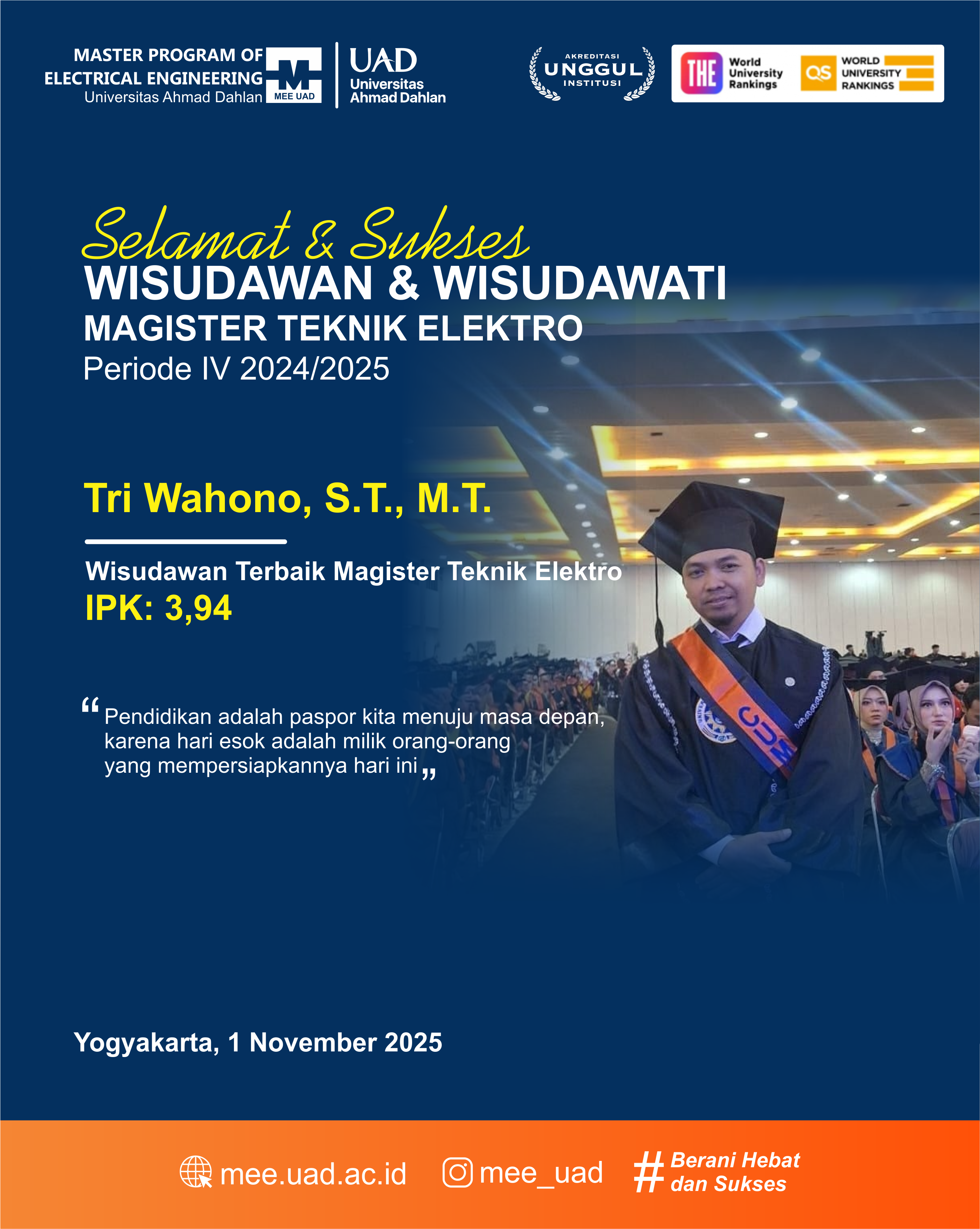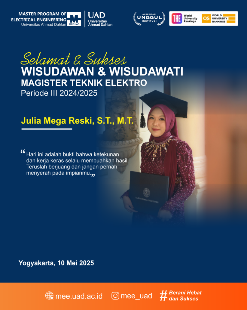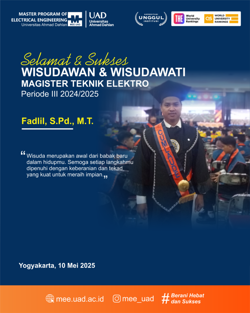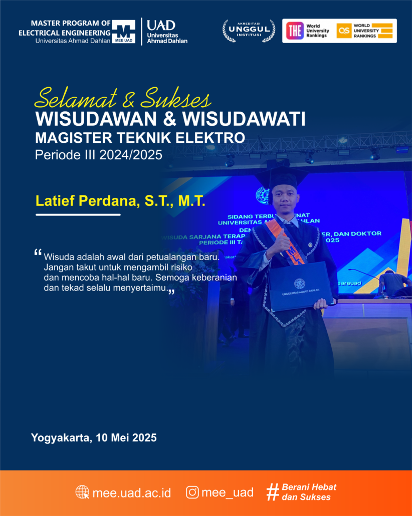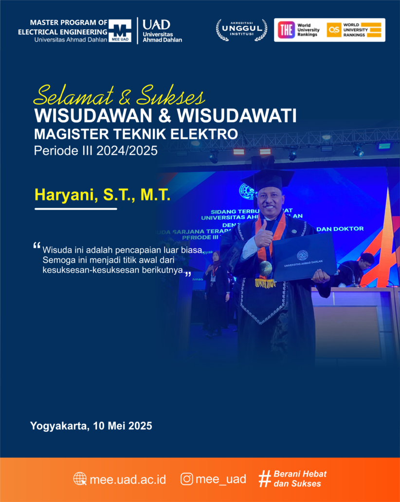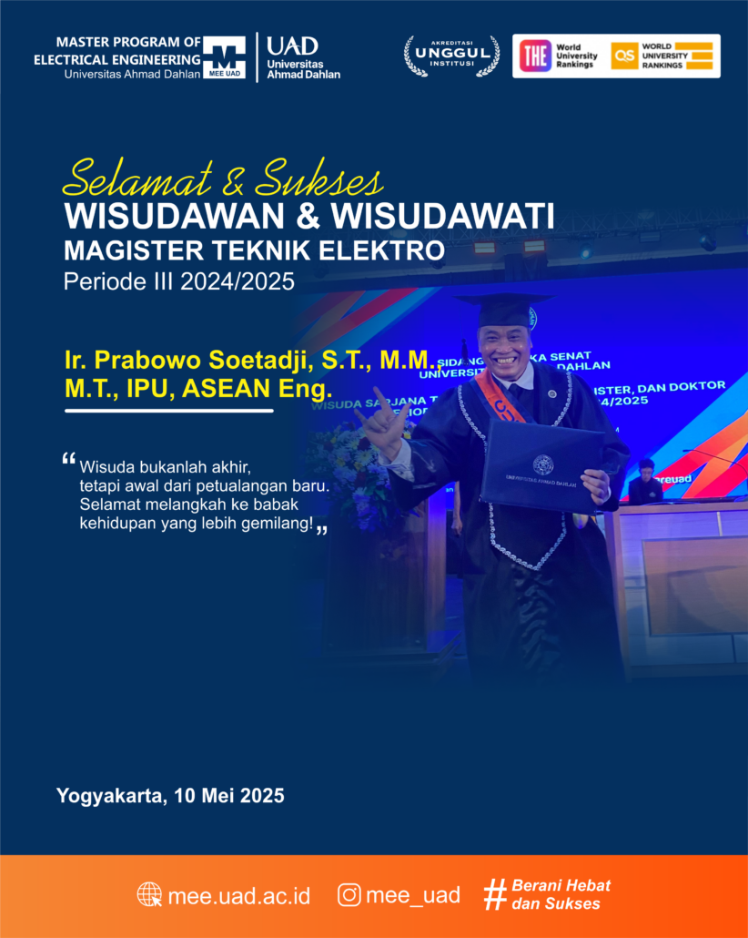 Alumni Magister Teknik Elektro Universitas Ahmad Dahlan (MEE-UAD) merupakan cerminan nyata dari dedikasi, kerja keras, dan ketekunan dalam menempuh pendidikan tinggi di bidang teknik. Setiap kelulusan bukan sekadar seremoni akademik, melainkan bukti bahwa proses panjang yang dilalui—mulai dari perkuliahan, riset, hingga penyusunan tesis—telah membentuk insan teknik yang tangguh dan siap menghadapi tantangan dunia nyata.